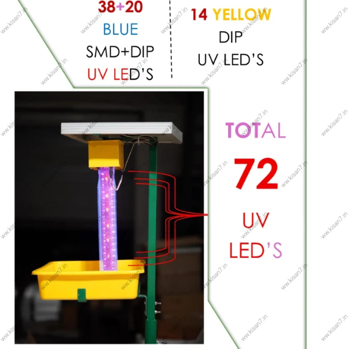 An intelligent automatic day–night sensor activates the light at dusk and switches it off at sunrise, eliminating manual operation while conserving energy. The UV light effectively attracts harmful insects such as moths, beetles, and borers, helping protect crops naturally without chemicals.